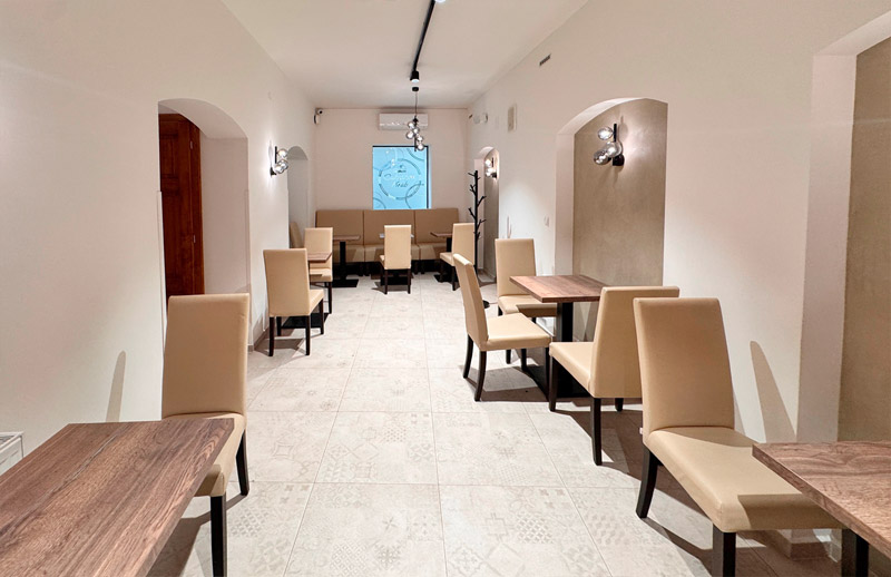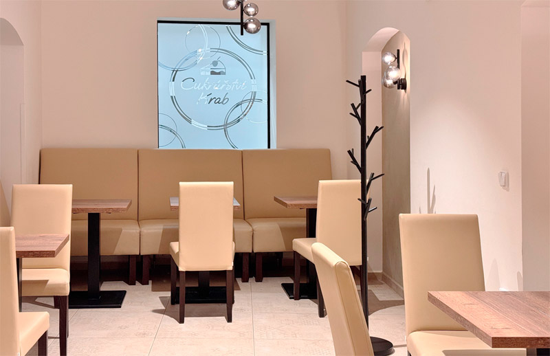 Dále nabízíme teplé, studené nápoje v příjemném posezení s možností náhledu do cukrářské výroby.